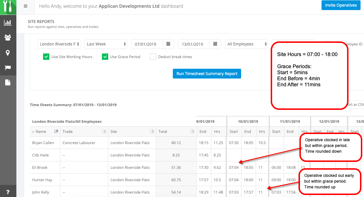 You can add a Grace Period to Clock In and Outs so that start or end times are rounded up/down. If you add a Grace Period for a Site, you can then select the Grace Period Filter in Timesheet Reports which will automatically apply the grace period when calculating Total Working Hours e.g.