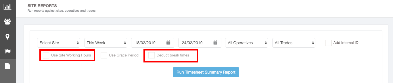 You can add a Sites Working Hours so that an Operatives Hours are calculated from when work starts and not before. You can also set Breaks for the Site. If you add a Start time for a Site or Break, you can then select the Working Hours / Break Hours Filter in Timesheet Reports which will automatically apply when calculating Total Working Hours e.g.